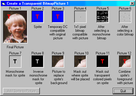 We are now left with two DCs: a color one of the bitmap with the "T" masked out
