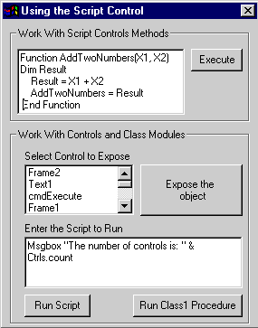 In other words, the Script Control can behave as a macro engine to interpret source code, call the methods of a component or set a component's properties. For example, you can run your host program then type a new function into a textbox and have your application run it.