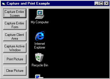 This program shows how to capture any form or window, including the screen or desktop window, into a picture object. Then the image can be sent to the printer using the PaintPicture method of Visual Basic's Printer object. This program illustrates how to: