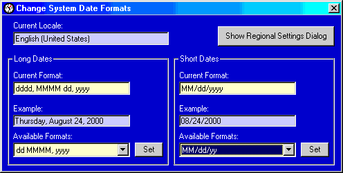 This sample illustrates how to list Window's current Long and Short Date formats and how to change them programmatically. It also shows how to open a Control Panel applet, Regional Settings in this case.