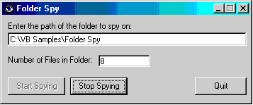 Now run Folder Spy again and click the "Stop Spying on Folder" button on the Stop Spying form. You will see that this causes FolderSpy to immediately stop waiting and start responding to your input again.