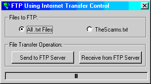 Using the Microsoft Internet Transfer Control you can easily FTP files between a client and host computer. This program contains a class module that exposes methods allowing you to send and receive one or more files to or from a host computer using the File Transfer Protocol.